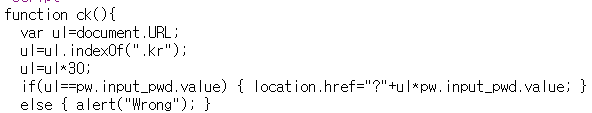 위 함수를 참고해서 소스코드를 번역해보면 .kr의 위치값을 ul에 저장하고 30을 곱하는데 그 값이 pw.input_pwd.value의 값과 같으면 문제가 풀리는 것 같다.